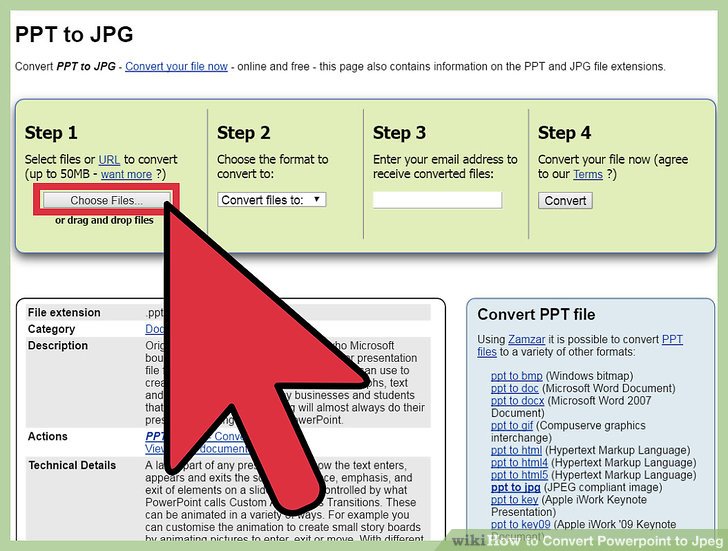 Use your own discretion when using links from untrustworthy sources as other sites might perform malicious actions on your computer. 1 Open your presentation file. Click on "choose file." This opens a file browser that requires a Powerpoint ppt file as a source. 1 Select the PowerPoint file. Select your ppt file either by double clicking on the file, or by clicking on the file then click on "Open" to open the file. 3 Convert your presentation to JPEG. Click "Convert File to JPG."